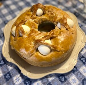 Lavorare la farina, lo strutto, lo zucchero, il sale e il pepe con l’acqua nella quale è stato sciolto il lievito per 10/15 minuti. Lasciar lievitare l’impasto per almeno tre ore o comunque fino a quando sarà raddoppiato. Riprendere l’impasto e stenderlo con le mani in un rettangolo grande lasciando un piccola quantità per il decoro. Distribuire sopra tutti gli ingredienti tagliati a cubetti (parmigiano e pecorino grattugiati) e arrotolare formando un salsicciotto. Far lievitare nuovamente per 1/2 ore. Appoggiare poi sopra le 4 uova e fermarle con le striscioline di pasta posizionando a croce. Spennellare con tuorlo d’uovo e cuocere in forno per circa 50 minuti a 180°.