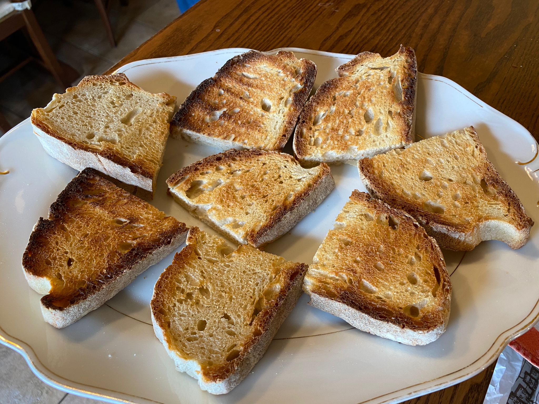 Nicoletta oggi ha voluto riportarci una serie di antipasti che sono la sua specialità: crostini di pane con uova di quaglia al tegamino, crostini di gorgonzola, miele al tartufo, crostini di coppa con limone a filetti sopra, torta al testo e prosciutto.