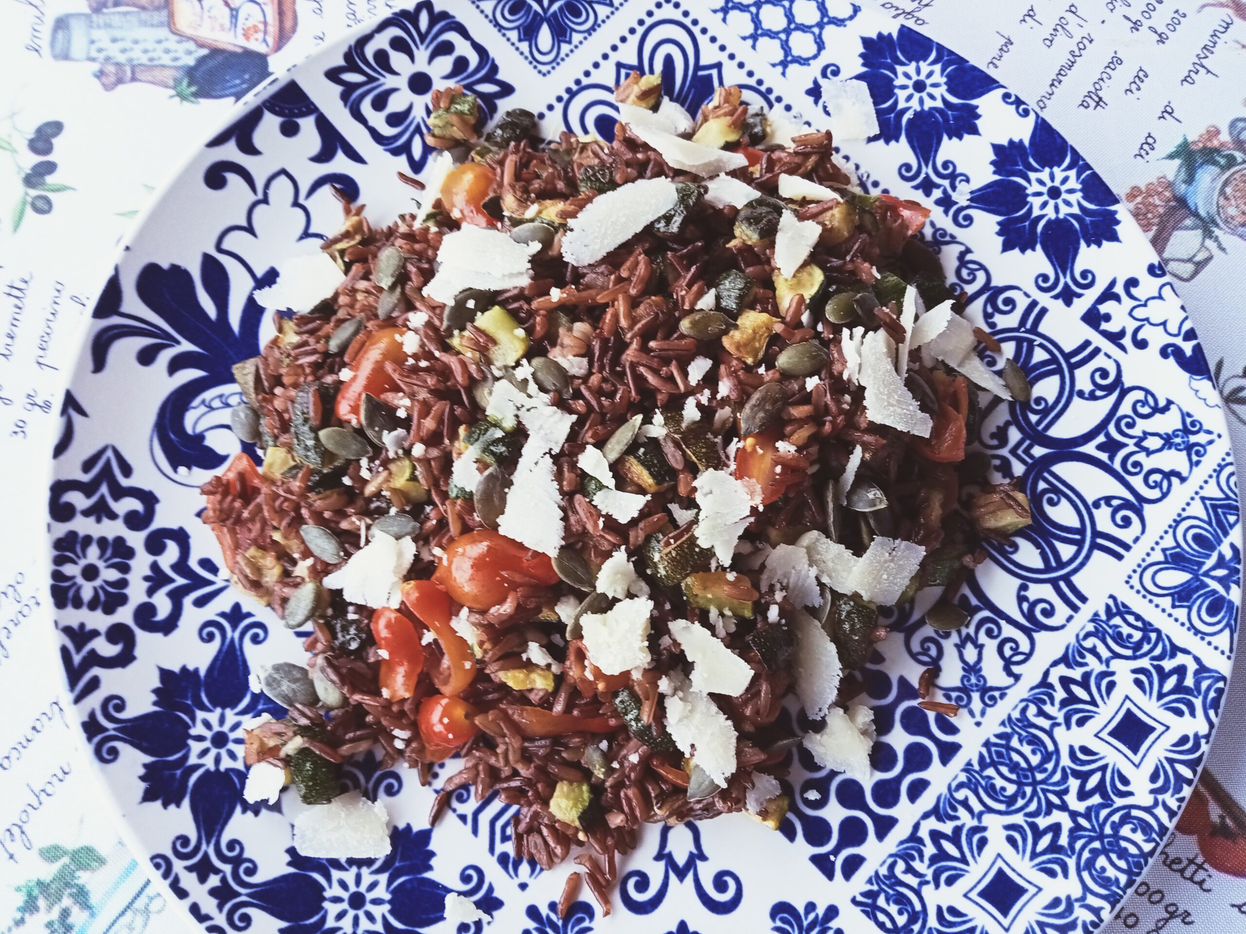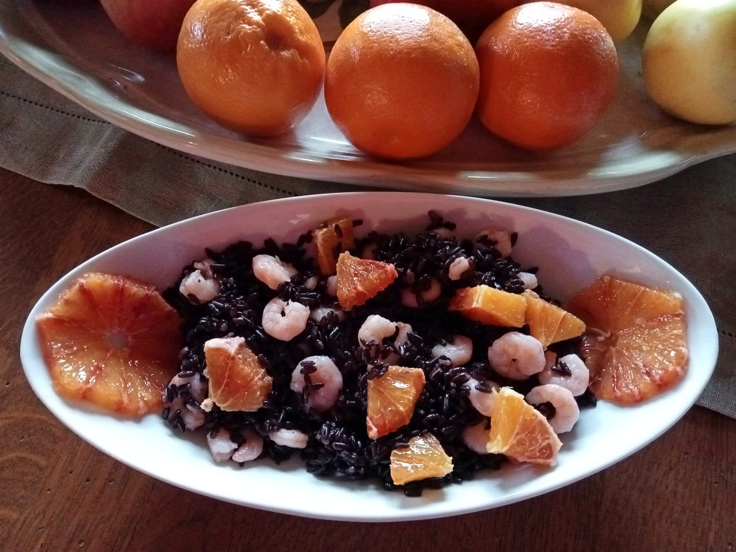 Potremmo anche pensare ad un piatto sì veloce ma un po’ più invitante. Per esempio un Riso Venere con gamberetti e arance che volendo potete acquistare già pronti e che potrete preparare mentre cuoce il riso.