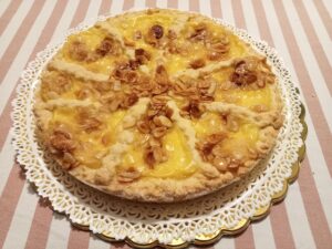 Impastare la farina con il lievito, l’uovo e 50 gr. di margarina di frigo. Mettere in frigo l’impasto morbido ottenuto. Preparare la crema poi sciogliere in un padellino il burro, il miele e lo zucchero. Aggiungere le mandorle e lasciarle caramellare un poco. Ora riprendere l’impasto e foderarvi la teglia per crostate opportunamente passata con burro e zucchero. Stendere sopra la crema e le mandorle.