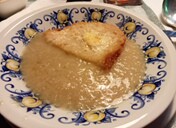 Affettare sottilmente le cipolle e insaporirle nel burro e olio aggiungendo un po’ di sale. Dopo poco versarvi la farina e lo zucchero, mescolare bene e appena la farina tende a scurirsi versare mezzo bicchiere di vino. Lasciare evaporare ed aggiungere poi il brodo poco alla volta. Lasciar stufare le cipolle per circa un’ora. Metterle ora in una pirofila da forno coprire con fette di pane casareccio e mettervi sopra la groviera grattugiata. Grigliare al forno alla massima temperatura per 5 minuti circa.